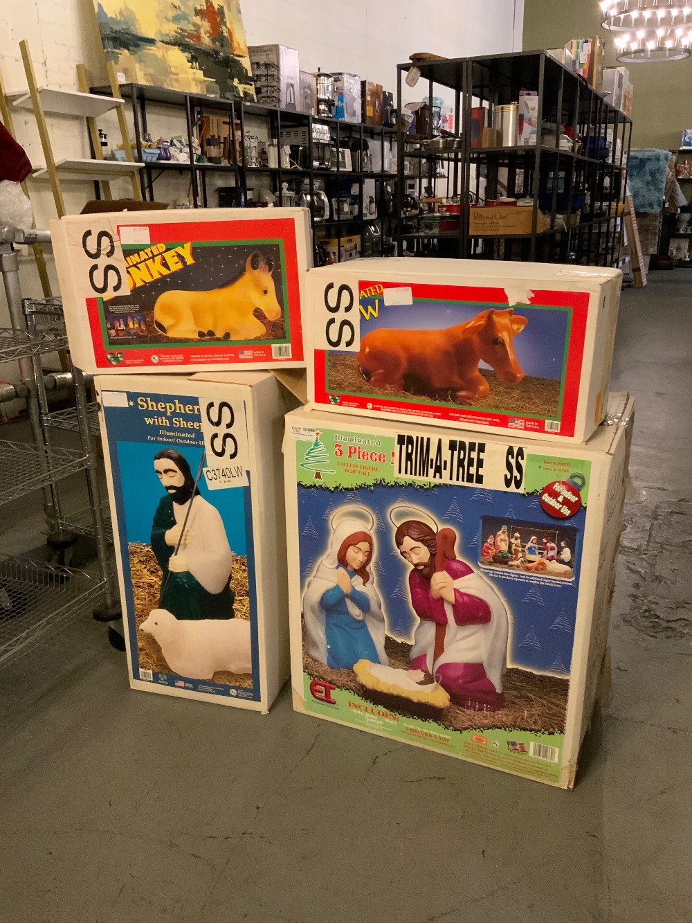 7 Pc Nativity Blow Mold Set Shepard: 15 W x 12 D x C 31 H Cow: 22 W x 10 D x 11 H Donkey: 19 W x 7 D x 12 H Mary/Joseph: 24 W x 17 D x 28 H
