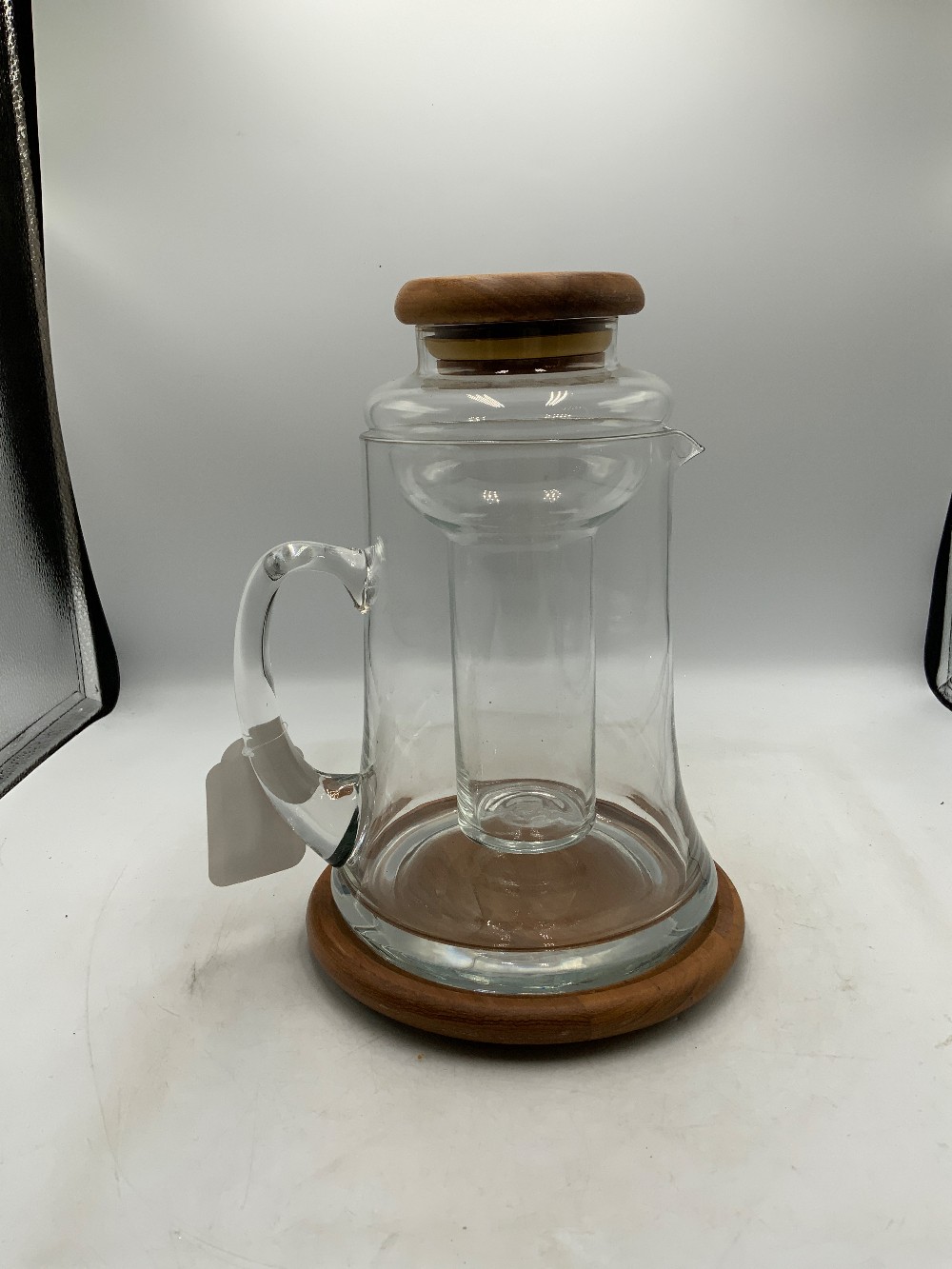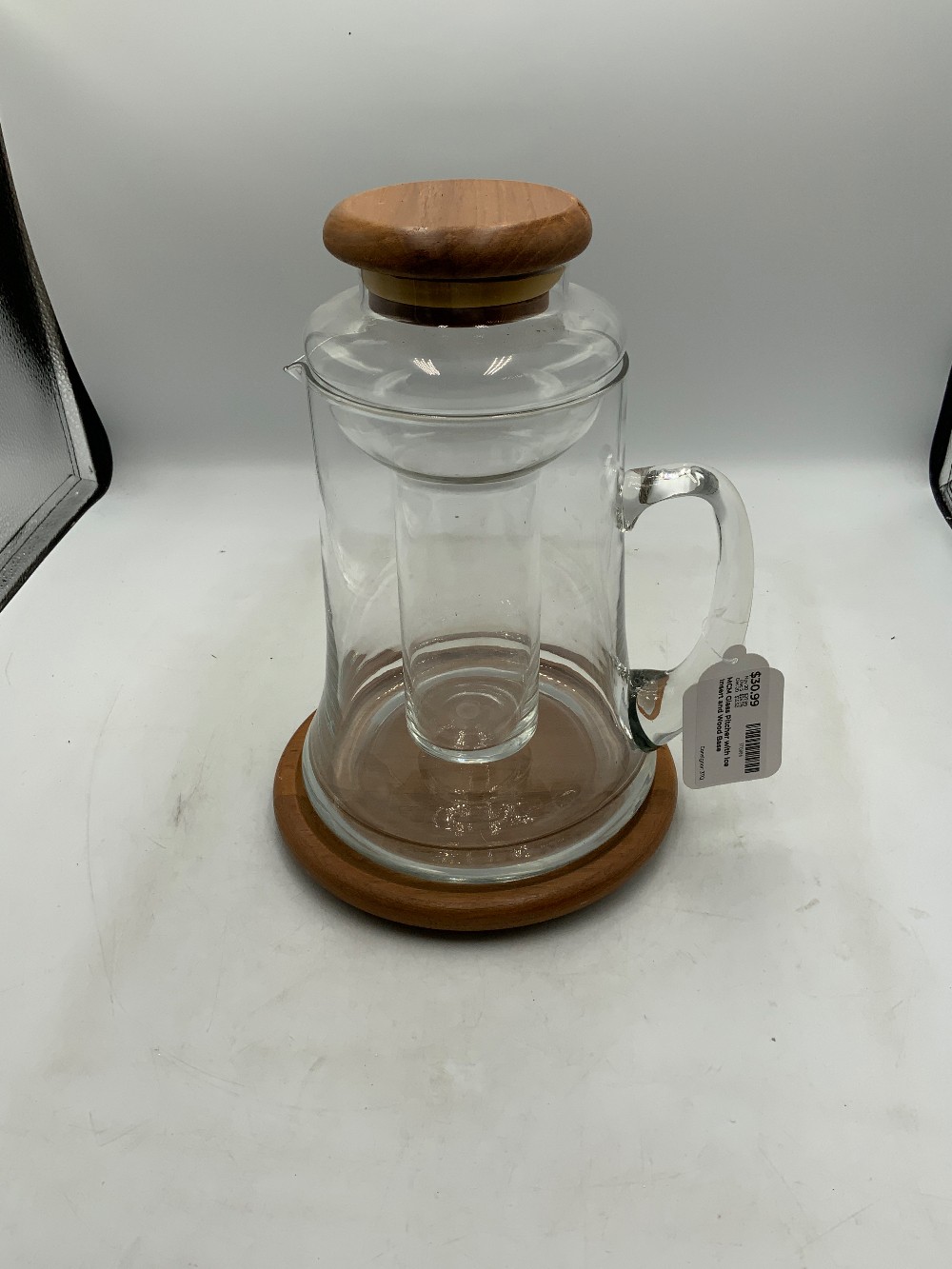 11 in Tall MCM Glass Pitcher with Ice Insert and Wood Base